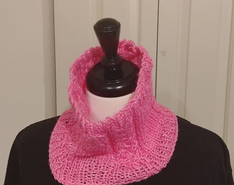 Bright pink cable knit cowl offers not only cozy warmth, but a pretty cable pattern with a nice pop of color.