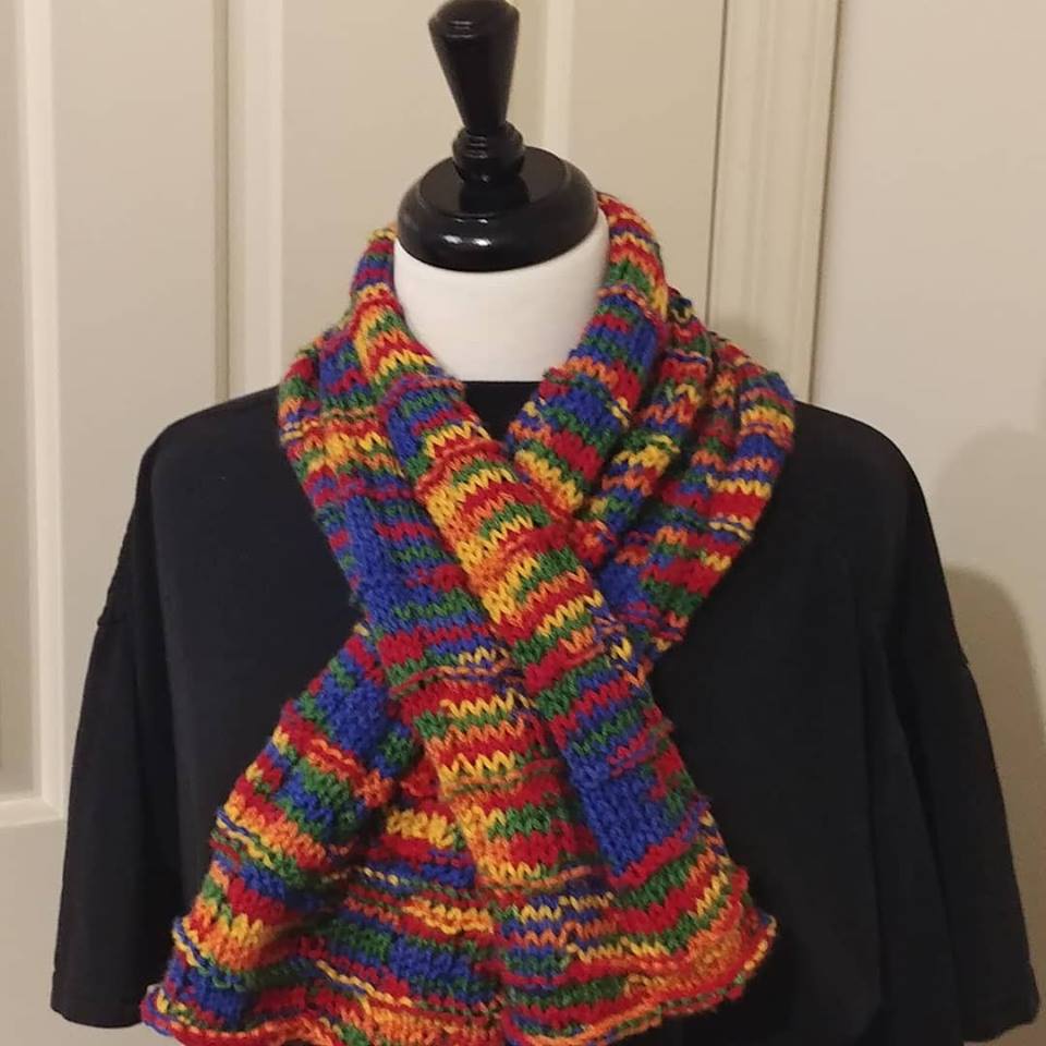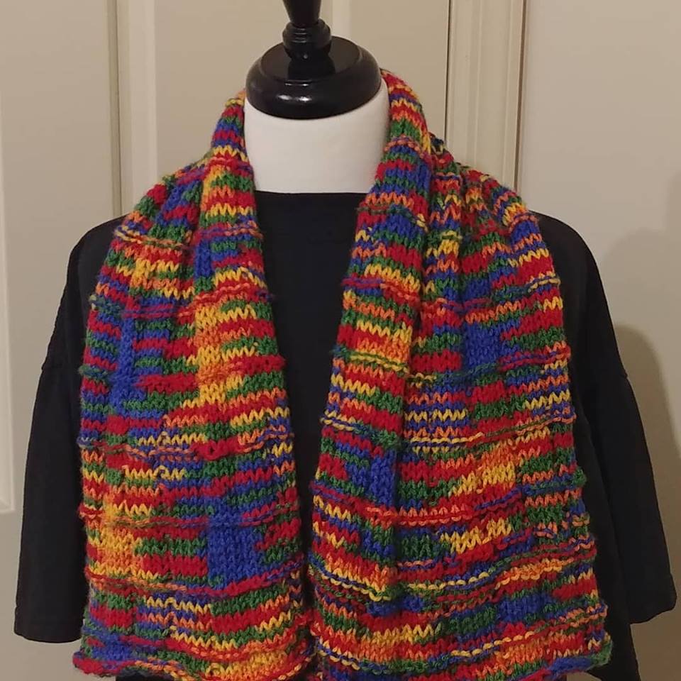 Classic colors rainbow scarf shows off cheerful bright colors such as red and orange. Tile stitch offers a fun texture to the scarf. Light, yet cozy and warm it is perfect for Spring weather and great for colder seasons.