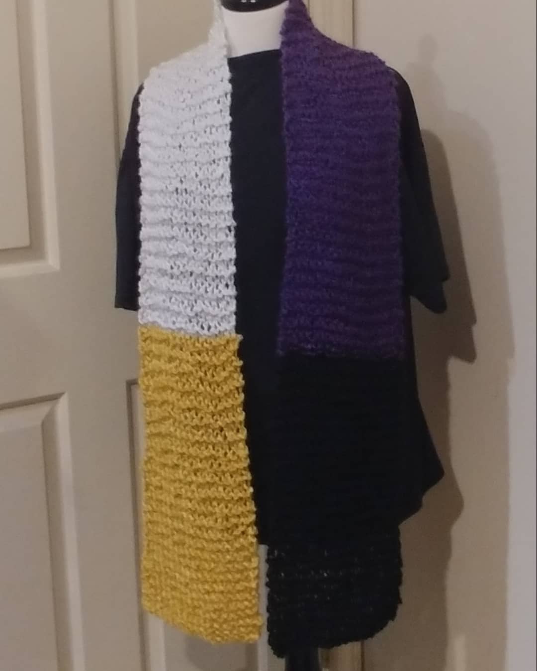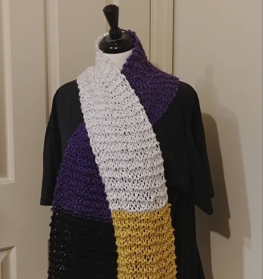 Simply Pride scarf is a special commission featuring pride colors in our LGBTQIA+ community. Scarf shown is non binary pride colors. Hand knit with 100% acrylic yarn, scarf measures 72 inches long and 10 inches wide. Scarf is machine wash and dry for added convenience. Custom Pride colors are available. Custom scarves take a little more time to make. Please send a message via the Mothergamer Knits Facebook page or send an email at [email protected] with desired colors.